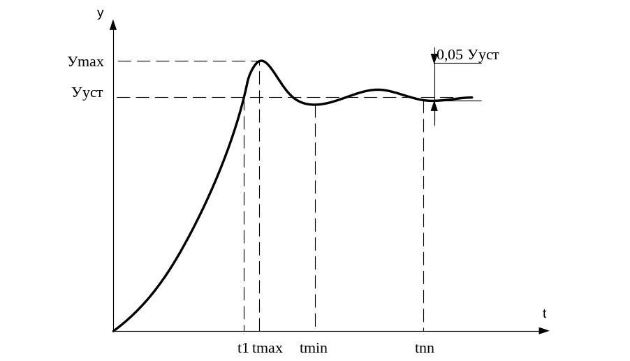 3 За допомогою вимірювальної лінійки знайдіть стале Yуст і максимальне Ymax значення перехідної характеристики, час першого узгодження t, час досягнення максимуму tmax, час досягнення мінімуму tmin і час перехідного процесу tпп. Обчисліть величину пере регулювання