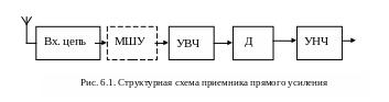 Структурная схема приемника прямого усиления без регенерации (рис. 6.1.) включает в себя входную цепь, усилитель высокой (радио) частоты (УВЧ, УРЧ), детектор (Д) и усилитель низкой (звуковой) частоты (УНЧ, УЗЧ). Иногда перед УРЧ включают малошумящий усилитель (МШУ).
