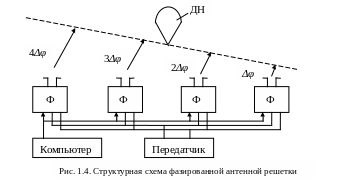 В последние годы в системах связи широко применяют так называемые фазированные антенные решетки (ФАР). Подобные антенны представляют собой совокупность (решетку) определенным образом расположенных в одной плоскости (в площади квадрата или прямоугольника) элементарных излучателей, питаемых через индивидуальные фазовращатели одним источником высокочастотных колебаний (рис. 1.4). Электромагнитные поля, создаваемые каждым излучателем, суммируясь в пространстве, образуют единый электромагнитный фронт волны. Это поле обычно представляет узконаправленный луч энергии – требуемую ДН.