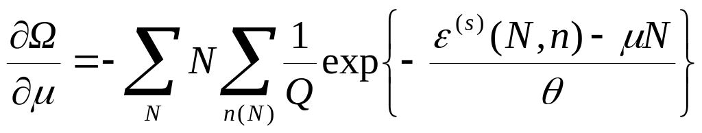 и, дифференцируя эту функцию по внешним параметрам, температуре и химическому потенциалу, попытаемся выразить через нее внутренние термодинамические характеристики нашей системы – внутреннюю энергию, термодинамические обобщенные силы, среднее число частиц в системе и ее энтропию.
