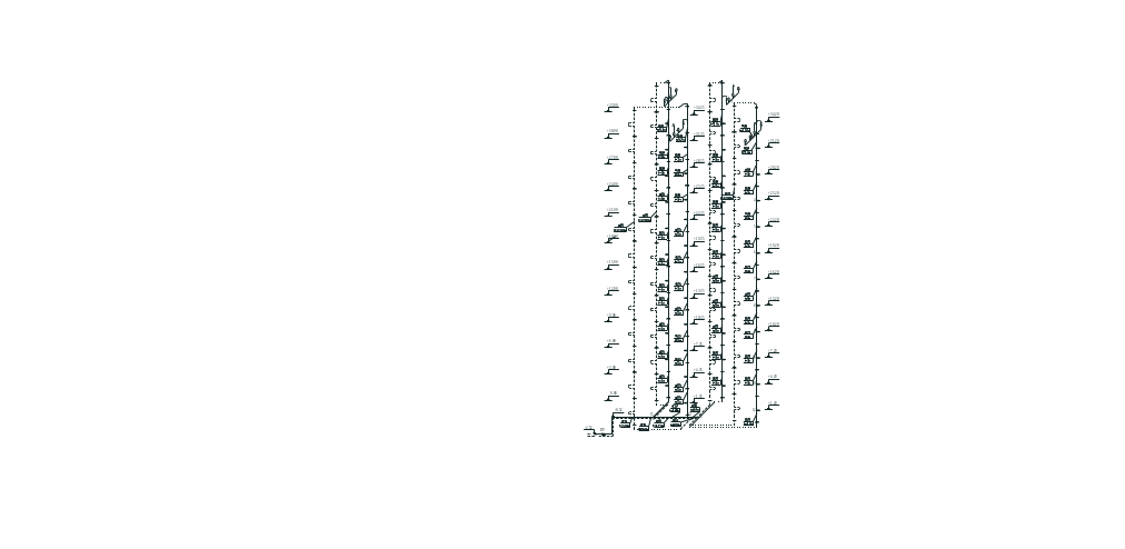 Аксонометрическая схема строится аналогично схеме системы холодного водоснабжения. Отличием является то, что появляется циркуляционный трубопровод с полотенцесушителями. На планах указывается место расположения подающего трубопровода основной линией, а штрихпунктирной линией указывается циркуляционный трубопровод. На месте же эти два трубопровода располагаются один над одним. И второе отличие: не проектируется противопожарные стояки. Желательно ввод горячего водоснабжения делать отдельно от ввода холодного водопровода.