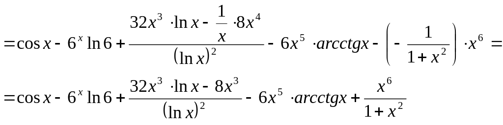 в) Для відшукання похідної функції застосуємо метод логарифмічного диференціювання. Логарифмуючи рівність за основою е, дістанемо