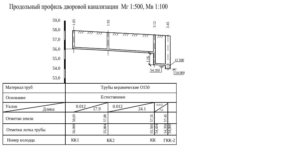 Для построения продольного профиля дворовой канализации необходимо подобрать диаметры, уклоны и степень наполнения труб, определить отметки лотка труб и глубины колодцев. Диаметры внутренней и дворовой канализации определяют на основании расчётных расходов сточных вод по участкам. Зная диаметры труб и расчётный расход на участках, по таблицам определяем уклон и степень наполнения труб, а также скорость течения сточных вод в трубах.