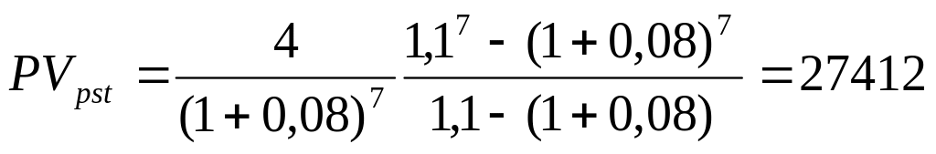 Поскольку ежегодно платежи увеличиваются в 1,1 раза (на 10%), то поступающие на счет платежи представляют собой переменный аннуитет постнумерандо с постоянным относительным изменением его членов. Поэтому для оценки контракта воспользуемся формулами (2.5) и (2.6) при А = 4000; п = 7; r = 0,0; х = 1,1: