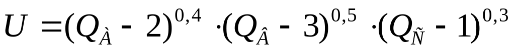 1. Пусть потребитель приобретает три вида блага (А, В,С), функция полезности в этом случае будет иметь следующий вид: U=f (Qa,Qb,Qc). В степенном виде данная функция будет записываться следующим образом: