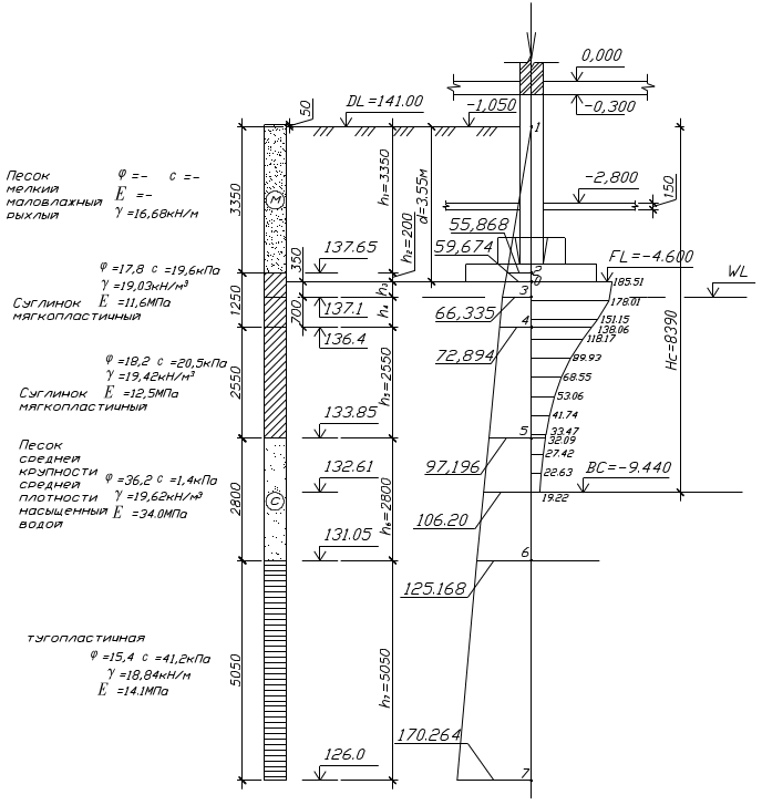 Определяем вертикальные напряжения от собственного веса грунта в характерных плоскостях:
