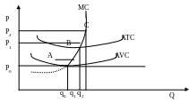 Там, де граничні витрати (МС) дорівнюють середнім сукупним витратам (АТС), визначається точка самоокупності (точка В) (Рис.2).