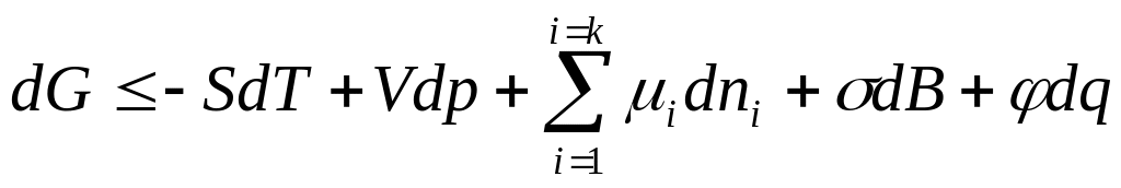 где S – энтропия; dT, dp – изменения температуры и давления соответственно; V – объем; σ – поверхностное натяжение; dB – изменение поверхности раздела фаз; μi, ni – химический потенциал и число молей компонента i; φ, q – электрический потенциал и заряд поверхности.