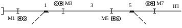 На данном участке определяются маршруты: от М1 до М5, по М5 за М7, по М7 до М3, по М3 за М1. Передвижение из тупика за светофор М3 нельзя записать в качестве маршрута, так как выезд за светофор М3 неизбежно влечет за собой занятие секции 3СП подвижным составом и включение соответствующих зависимостей в функциональные цепи с ограничением их в блоке светофора М5. Нельзя также в качестве маршрута записать передвижение из тупика на путь IП, так как при этом требуется открыть не только светофор М1, но и М5. Следовательно, такое передвижение состоит из двух маршрутов: до светофора М5 и по М5 за М7.