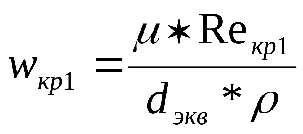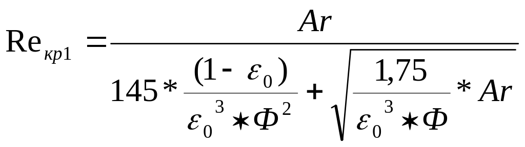 По рассчитанному значению числа Рейнольдса рассчитывают значение первой критической скорости по формуле – начало псевдоожижения: