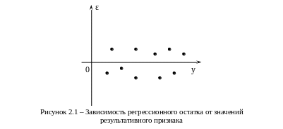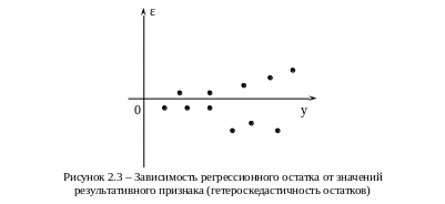 Если значения остатков расположены вблизи горизонтальной прямой (оси абсцисс), то их можно считать случайными (как на рис. 2.1). На рис. 2.2 остатки носят систематический характер. На рис. 2.3 дисперсия остатков, соответствующих большим значениям y, больше, чем дисперсия при малых y, т.е. имеет место гетероскедастичность остатков.