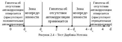 Приближение к значениям 0, 2 и 4 определяется верхней и нижней границами dв и dн, которые вычислены для различных уровней значимости и приводятся в соответствующих таблицах. Отобразив значения d на числовой оси, можно схематически представить использование теста Дарбина-Уотсона в виде рисунка 2.4. При этом, если фактическое значение критерия попадает в область неопределенности, то нельзя с необходимой уверенностью ни отклонить, ни принять нулевую гипотезу, т.е. вопрос о наличии или отсутствии автокорреляции остается открытым.