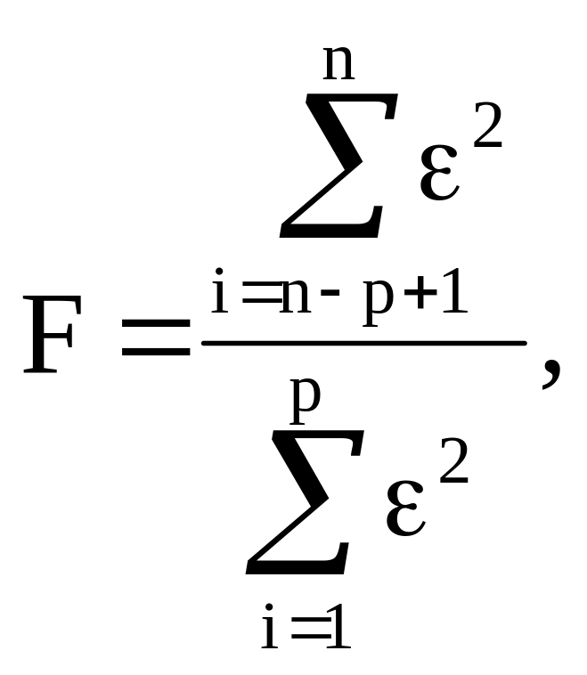 Можно доказать, что эта гипотеза принимается, если отношение суммы квадратов остатков для этих групп не превышает табличного значения критерия Фишера (чем это отношение меньше, тем ближе дисперсии друг к другу). Фактическое значение критерия Фишера F рассчитывают по формуле: