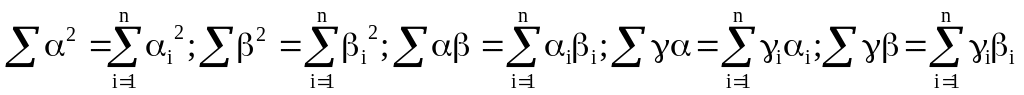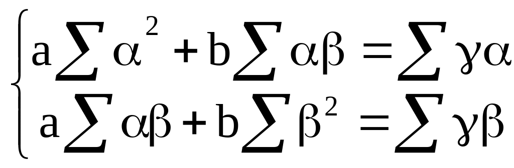 Полученное выражение представляет собой уравнение множественной (двухфакторной) линейной регрессии, в которой результативный признак обозначен γ, а признаки-факторы - α и β. Параметры регрессии a и b можно найти из системы нормальных уравнений (2.3). В данном случае первое уравнение в системе (2.3) следует опустить, так как свободный член регрессии (2.21) равен нулю (здесь оба параметра - a и b - представляют собой коэффициенты при переменных). Система примет вид: