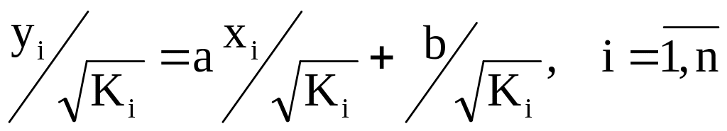 Для определения коэффициентов при использовании взвешенного МНК может быть использован следующий подход. Предположим, что дисперсии остатков σ2(εi) пропорциональны величине σ2(ε) (дисперсии генеральной совокупности значений случайной компоненты). Коэффициенты пропорциональности обозначим Кi, - эти коэффициенты характеризуют неоднородность дисперсии (способ их нахождения обсудим позже). Получим для каждого из n наблюдений: