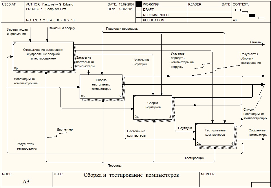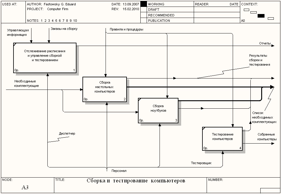 У цій лабораторній роботі побудуємо ще одну діаграму декомпозиції в нотації IDEF0 - декомпозицію роботи "Зборка і тестування комп'ютерів" діаграми А0.