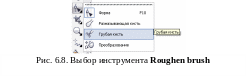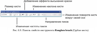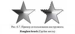 ыберите инструмент Roughen brush (Грубая кисть), щелкнув на одноименной кнопке панели Shape Edit Flyout (Изменение формы), как показано на рис. 6.8, или на кнопке Toolbox (Набор инструментов), если этот инструмент выбирался последним в панели Shape Edit Flyout (Изменение формы). После этого автоматически изменится панель свойств на Property Bar: Roughen brush (Панель свойств: Грубая кисть), показанную на рис. 6.9, а указатель мыши превратится в окружность с исходящим из ее центра отрезком. Размер указателя мыши зависит от настроек инструмента.