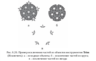 Работа инструмента Trim (Исключить) напоминает вырезание из раскатанного теста (последний выделенный объект) заготовок для выпечки печенья специальной формы (все остальные объекты).