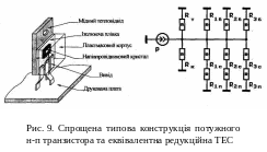 Тепловий опір RT відображає стік теплоти в навколишнє середовище через задню, бокові та відкриту частину передньої поверхні мідного тепловідводу з врахуванням отвору. Відвід теплоти через кожний вивід транзистора моделюється трьома тепловими опорами. Опір Rіб відповідає тепловідводу в оточуюче середовище через бокові поверхні і-го виводу, опір Rіс відображає відвід теплоти в друковану плату через поперечний переріз і-го виводу і опір Rіп моделює відвід тепла з поверхонь друкованої плати в навколишнє середовище для і-го виводу. Наведена теплоелектрична схема є, звичайно, спрощеною, оскільки вона не враховує багато факторів: наявність ізолюючої плівки, існування деякого проміжку між кристалом та торцем виводу, неоднорідність тепловідводу через бокові поверхні виводів внаслідок наявності пластмасового корпуса та інші. Проте зазначені спрощення не мають вирішального впливу на результати моделювання, і наведена теплоелектрична схема може бути застосована для моделювання теплового режиму транзистора.