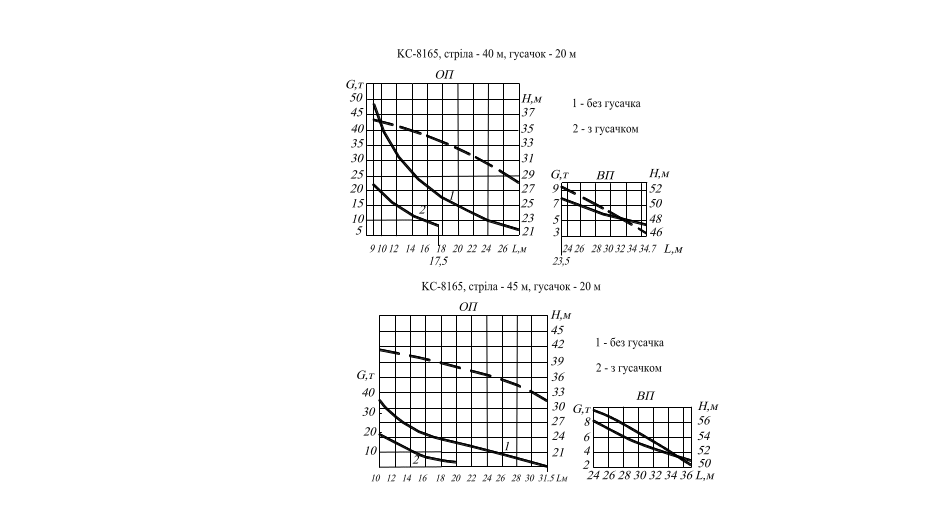 Рисунок 4.44 – Вантажні та висотні характеристики крана КС-8165 з довжиною стріли 40 та 45 м і гусачка – 20 м