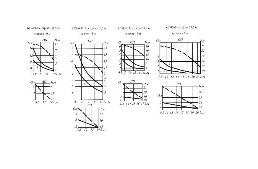 Рисунок 3.2 – Вантажні і висотні характеристики крана КС-4361А при довжині стріли 10,5; 15,5; 20,54 25,5 м