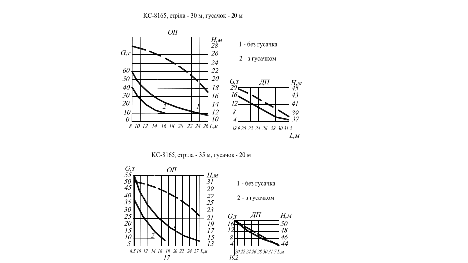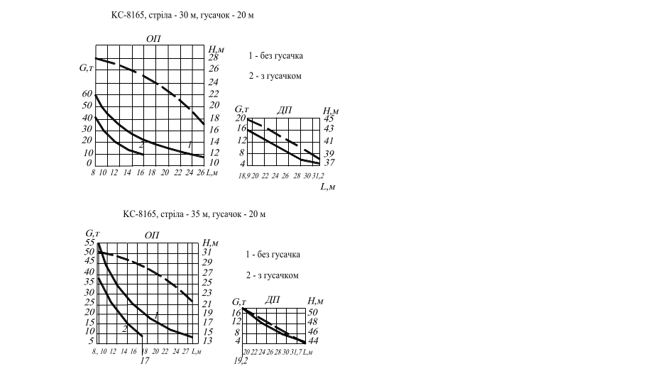 Рисунок 4.43 – Вантажні та висотні характеристики крана КС-8165 з довжиною стріли 30 та 35 м і гусачка – 20 м