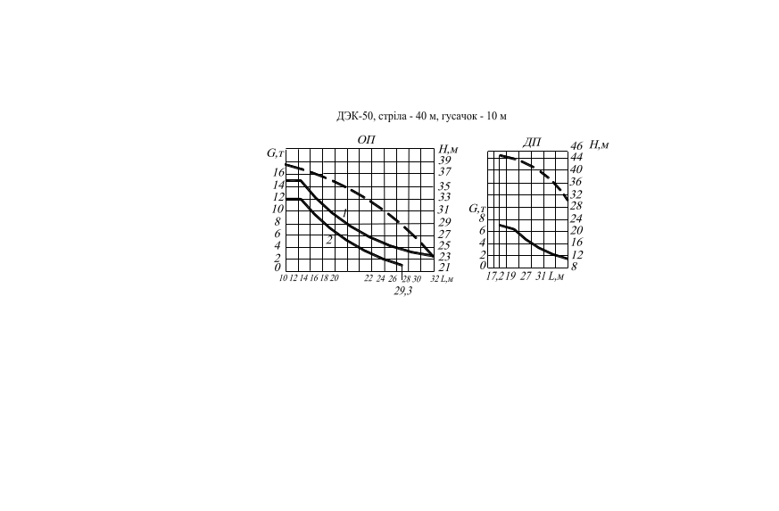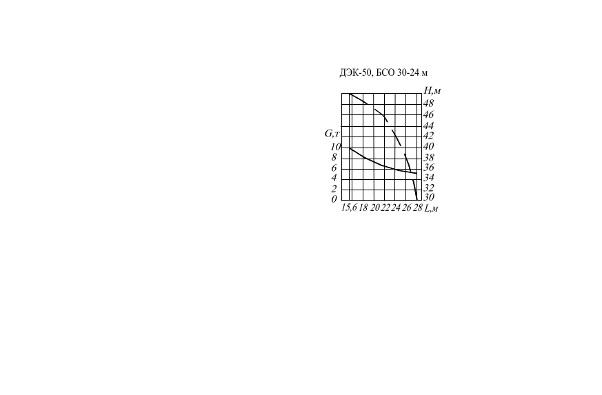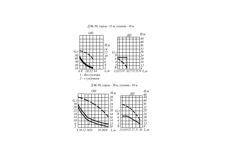 Рисунок 4.23 – Вантажні і висотні характеристики крана ДЭК-50 з довжиною стріли 15 і 30 м і гусачка – 10 м