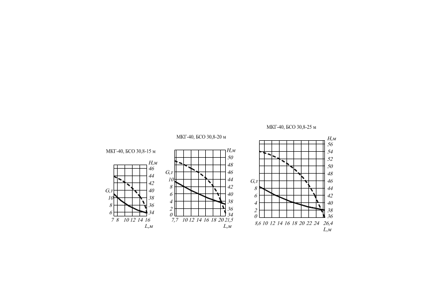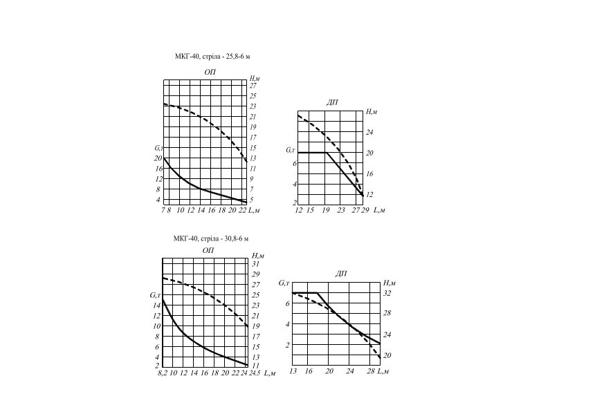 Рисунок 4.17 – Вантажні і висотні характеристики крана МКГ-40 з довжиною стріли 25,8 та 30,8 м і гусачка – 6 м