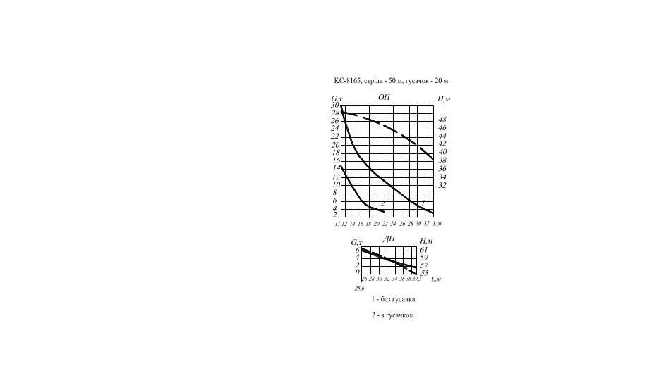 Рисунок 4.42 – Вантажні та висотні характеристики крана КС-8165 з довжиною стріли 20 (основний підйом) та 25 м та гусачка – 20 м