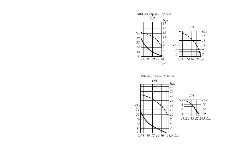 Рисунок 4.16 – Вантажні і висотні характеристики крана МКГ-40 з довжиною стріли 15,8 і 20,8 м