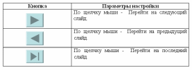 Начнем со второго слайда. В меню Показ слайдов – Управляющие кнопки. Выбираем нужную кнопку. В окне Настройка действия – По щелчку мыши – Перейти по гиперссылке выбираем: следующий слайд, предыдущий слайд и т.д. Изменим размеры кнопок с помощью мыши.