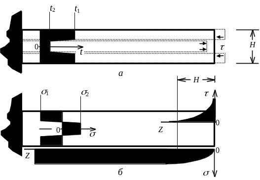 где σ1, σ2 — напряжения в крайних и среднем волокнах.