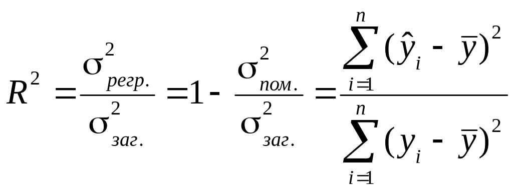 Перша частина цього виразу являє собою частину дисперсії, яку не можна пояснити через регресійний зв’язок, друга - частину дисперсії, яку можна пояснити, виходячи з регресії. Вона називається коефіцієнтом детермінації і використовується як критерій адекватності моделі, бо є мірою пояснювальної сили незалежної змінної: