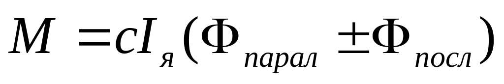 На каждом полюсе такого двигателя имеются две обмотки — параллельная и последовательная. Их можно включить так, чтобы магнитные потоки складывались (согласное включение) или вычитались (встречное включение). Формулы для скорости вращения и для вращающего момента двигателя со смешанным возбуждением выглядят следующим образом: