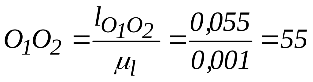 Под углом φ1 = 55° к линии O1O2 через точку О1 проводим ось ведущего звена и от этой точки откладываем на ней отрезок О1А. Это и будет изображение ведущего звена О1A в заданном положении.