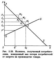 К этому понятию можно прийти и путем несколько иных рассуждений. С помощью рис. 2.25 определим потери в денежном выражении, которые понесут потребители от запрета на производство и потребление данного товара.