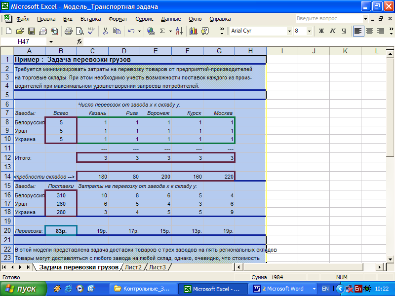 Рис.7.4. Рабочий лист «Задача перевозки грузов»: решение