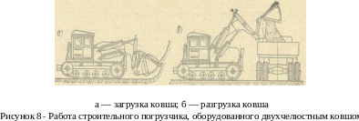 По способу разгрузки различают фронтальные погрузчики, полуповоротные и полноповоротные. Наибольшее распространение имеют погрузчики фронтального действия (рис. 8). Строительные погрузчики имеют быстросъемные сменные рабочие органы (ковши, крановое оборудование, вилочные подхваты, двухчелюстные ковши и др.).