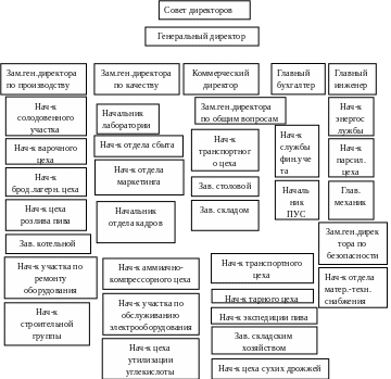 Структура управления ОАО «Вятич» является иерархической, так как вертикальные связи на предприятии преобладают над горизонтальными. Важнейшим принципом управленческой деятельности предприятия является принцип централизации. Централизованная форма управления предусматривает осуществление руководства хозяйственной деятельностью входящих в предприятие подразделений из одного центра (Генеральный директор), регламентацию и координацию их деятельности.