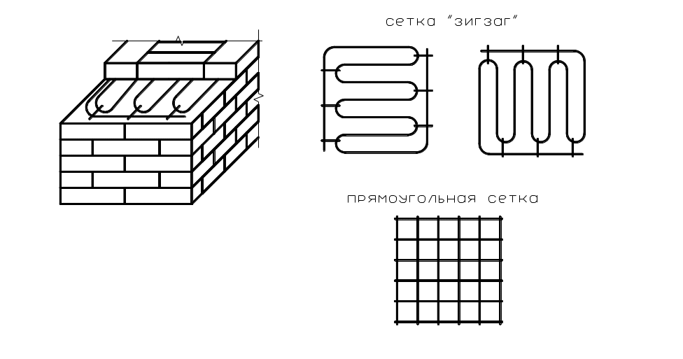 Расстояние между стержнями сеток должно быть не более 120 и не менее 30 мм. Стержни сеток воспринимают поперечные растягивающие усилия при сжатии кладки и препятствуют разрушению кирпича при изгибе и растяжении.