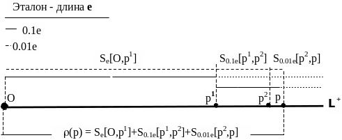Для примера (Рис.15) мощности отрезков, образующих мерные последовательности равны: num((Se([O,p1]))) = 2, num((S0.1e(p1,p2])) = 5, num((S0.01e(p2,p])) = 3. Следовательно, формула неотрицательного вещественного числа, обозначающего точку p имеет вид: