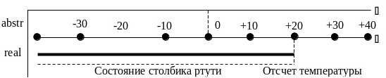 Кроме шкалы в измерительный прибор входит датчик, состояния которого представляют возможные значения измеряемой характеристики. В случае термометра, датчиком является столбик ртути, длина которого "следит" за температурой внешней среды. Подразумевается, что в каждый момент времени длина столбика ртути (текущее состояние датчика) отражает текущее значение t температуры внешней среды. Текущее состояние датчика указывает вполне определенную точку на физической линейке термометра, что позволяет произвести отсчет текущей температуры внешней среды (т.е. вычислить значение функции realabsr в точке t).
