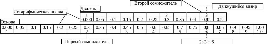 Логарифмическая линейка, точно также как и арифметическая линейка имеет неподвижную основу и подвижный движок. На основе располагаются две числовые шкалы: линейная шкала чисел и логарифмическая шкала чисел. В этом случае длина на логарифмической шкале представляет логарифм числа. Сложение длин, представляющих два сомножителя, дает в результате длину, представляющую произведение сомножителей. Результатом вычитание длин, представляющих делимое и делитель, является длина, представляющая частное от деления.