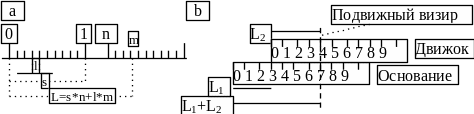 Простейшим аналоговым вычислительным прибором является так называемая арифметическая линейка, позволяющая автоматически выполнять операции сложения и вычитания. Такая линейка состоит из двух частей: основание - нижняя неподвижная часть и движок - верхняя подвижная часть (рис. 7). На основание нанесена числовая линейная шкала (рис.7 a). Каждый сектор s (между двух длинных соседних рисок) представляет собой единицу. Сектор s состоит из десяти интервалов, каждый из которых имеет длину l. Таким образом, длина сектора s = l*10. Каждая длинная риска помечена целым числом n, которое представляет порядковый номер этой риски в последовательности рисок. Длина части основания, заключенной между рисками 0 и n, равна Ln = s*n = (10*l)*n. Аналогичная числовая шкала нанесена на движок.