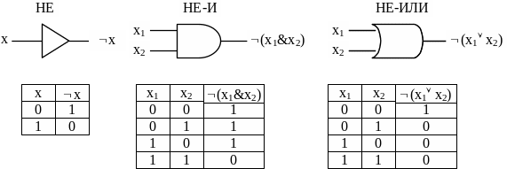 Рис. 73. Обозначение вентилей – вычислителей базисных логических функций и соответствующие таблицы истинности