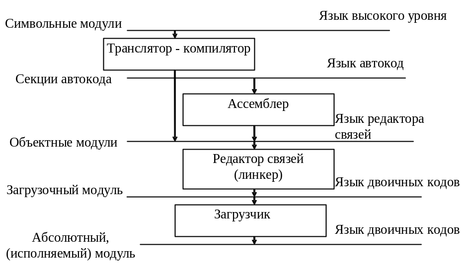 Начнем с автокода - ассемблера. Каждая секция программы, записанная на языке автокод, преобразуется транслятором ассемблирующего типа в объектный модуль, записанный на двоично-символьном языке, который "понимает" редактор связей. Этот редактор связей из нескольких объектных модулей формирует единый загрузочный модуль - перемещаемую двоичную программу. Эта программа записана в относительных адресах, как бы предназначенная для загрузки с нулевого адреса оперативной памяти. Загрузчик находит свободное место в оперативной памяти, в которое размещает загрузочный модуль, настраивая его по месторасположению. В результате получается абсолютный модуль, который может выполняться.