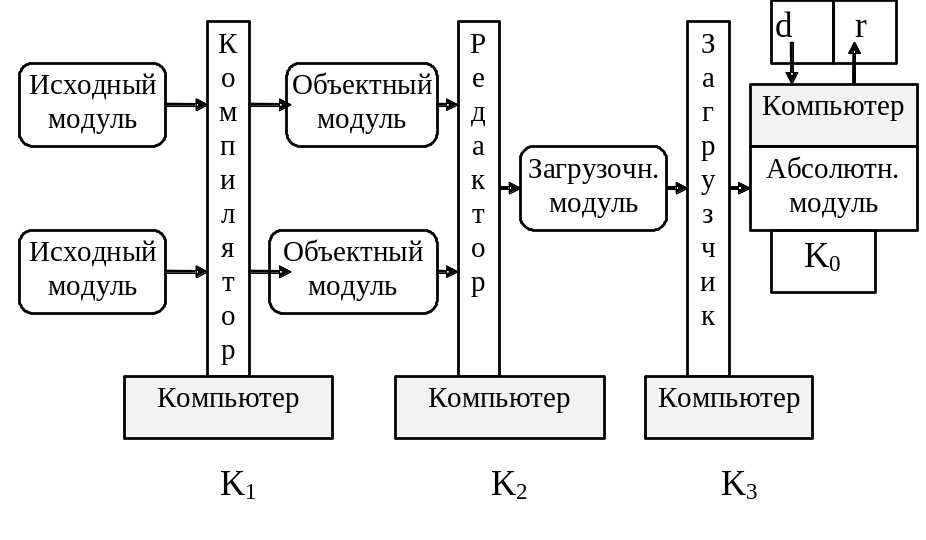 Технологическая схема компиляции изображена на (рис.83). Три компьютера (K1, K2, K3) выполняют системные программы компилятора, редактора связей и загрузчика. Чаще всего, в качестве этих компьютеров используется один и тот же реальный компьютер. В результате получается абсолютный модуль программы пользователя, который исполняется на компьютере K0, реализуя преобразование исходных данных d в результирующие данные r.