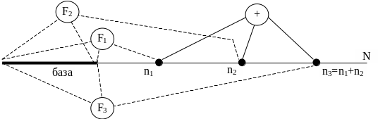 Чрезвычайно важно, что позиционная система счисления позволяет определить алгоритмы выполнения операций сложения - умножения натуральных чисел как преобразование исходных символьных записей (операндов операций) в результирующие символьные записи (результаты операций). При этом формула F3 результата операции обозначает значение суммы (рис.5): n3 = n1+n2.