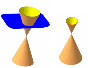 При пересечении конуса вращения плоскостью могут получаться: точка, прямая, пересекающиеся прямые, окружность, эллипс, парабола или гипербола.