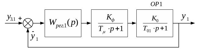 Следовательно, в разомкнутом внутреннем контуре имеется интегрирующее звено. Наличие такого звена в контуре регулирования приводит к тому, что в установившемся режиме (статике) отсутствует ошибка регулирования выходной величины y1 в соответствии с заданным значением y31 .